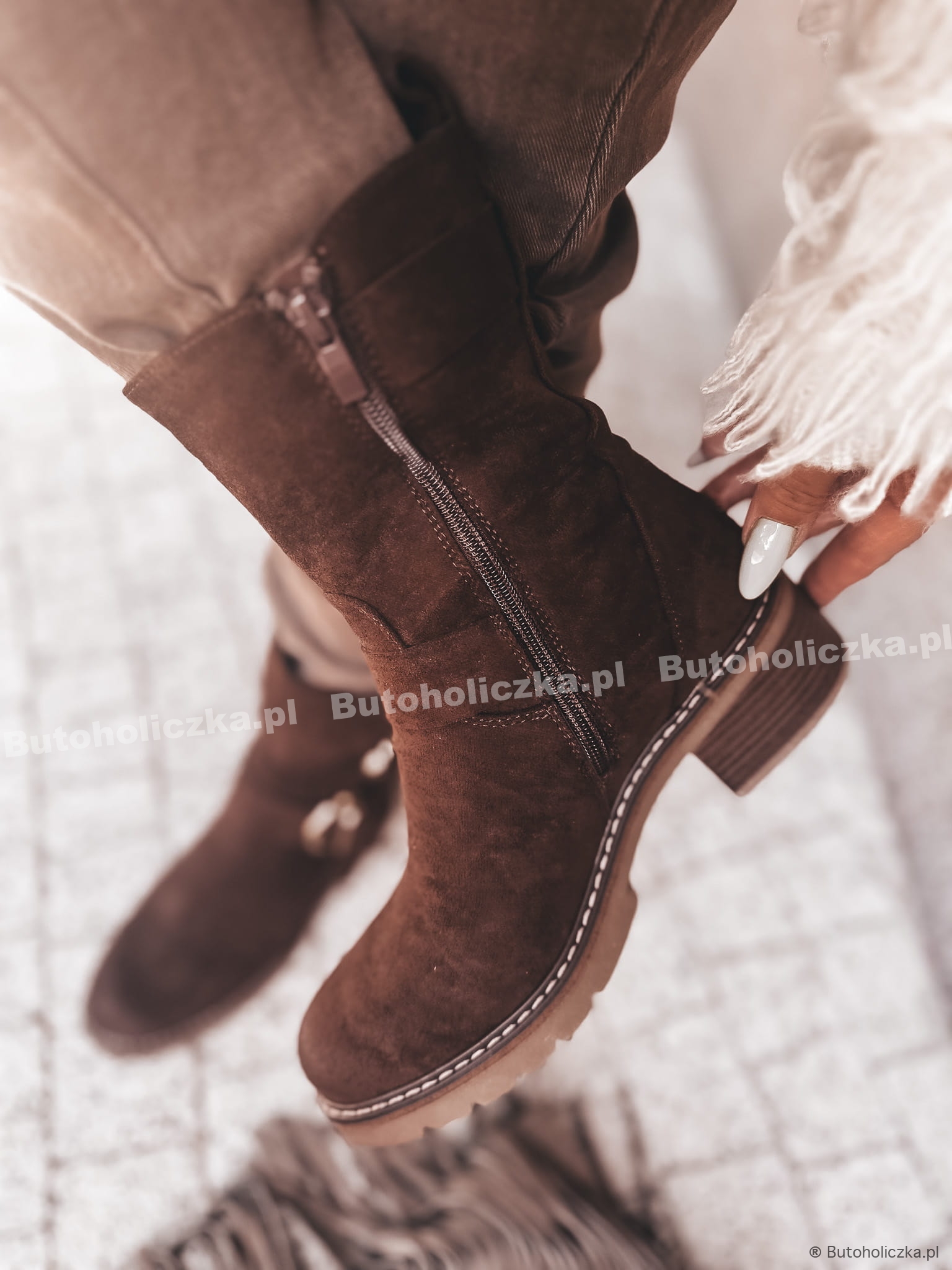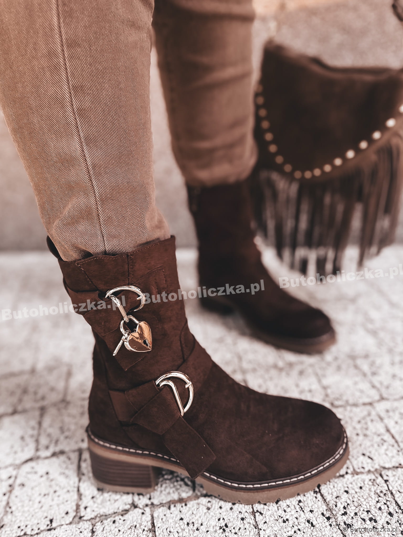 Klasyczne botki z dłuższą cholewką, wykonane z zamszu ekologicznego. Ozdabiane złotymi przywieszkami, kłódką i kluczykiem Ten model to hit tego sezonu! Wykonanie z dbałością o każdy szczegół sprawi, że będzie to Twój ulubiony model.
