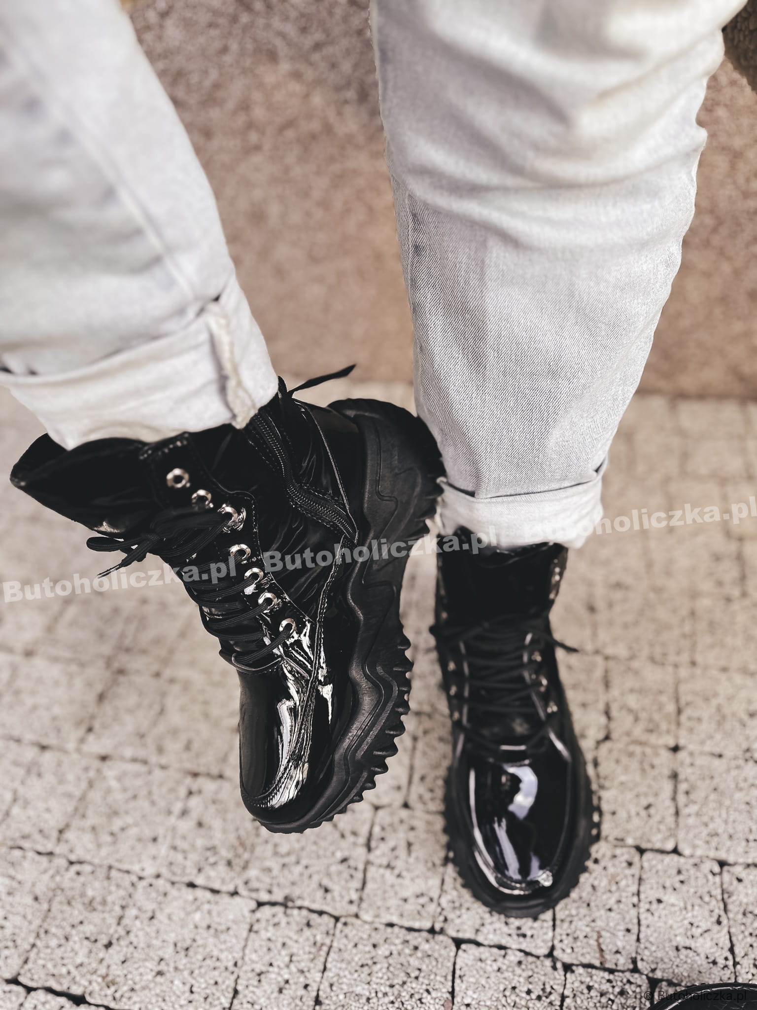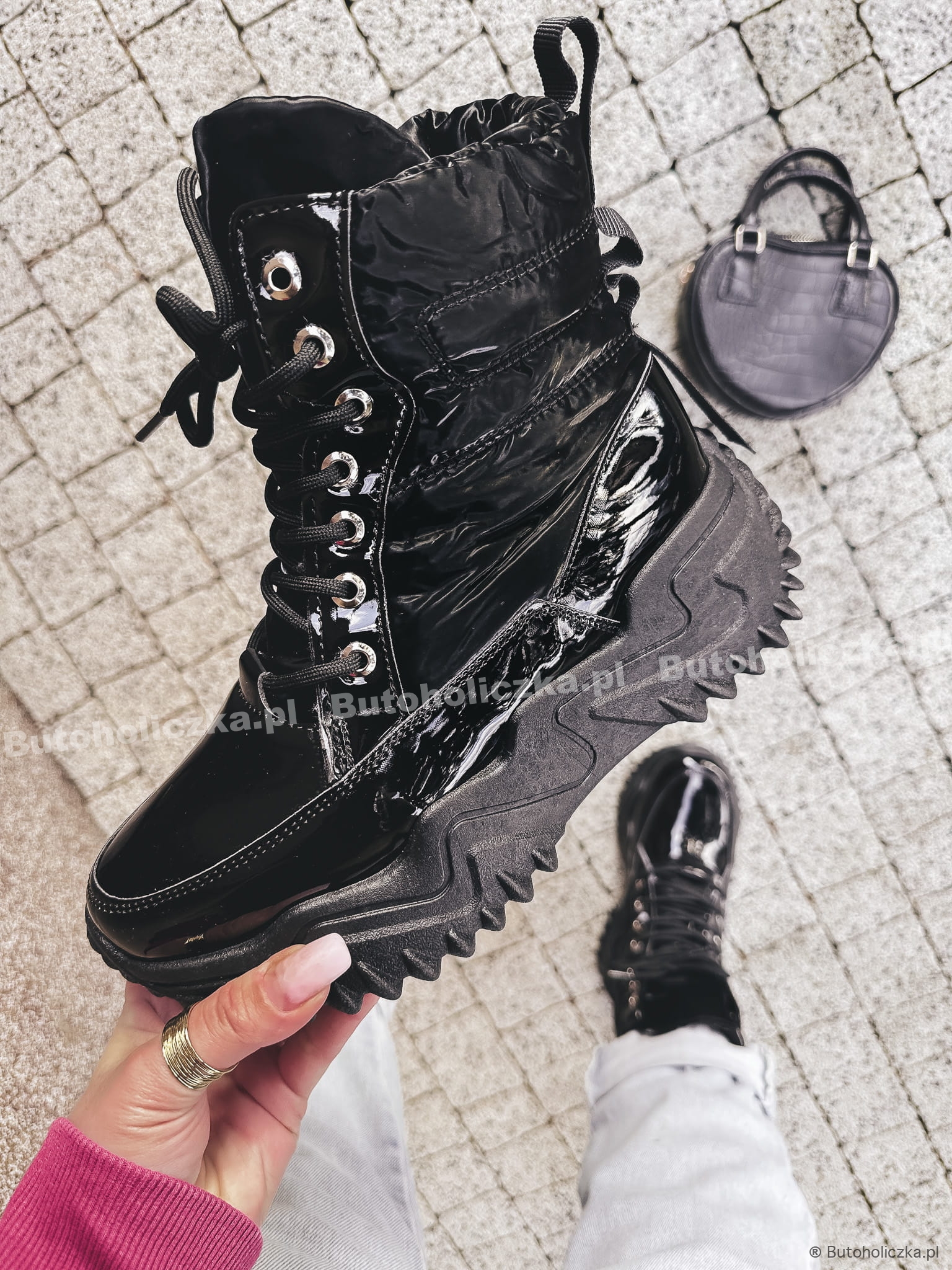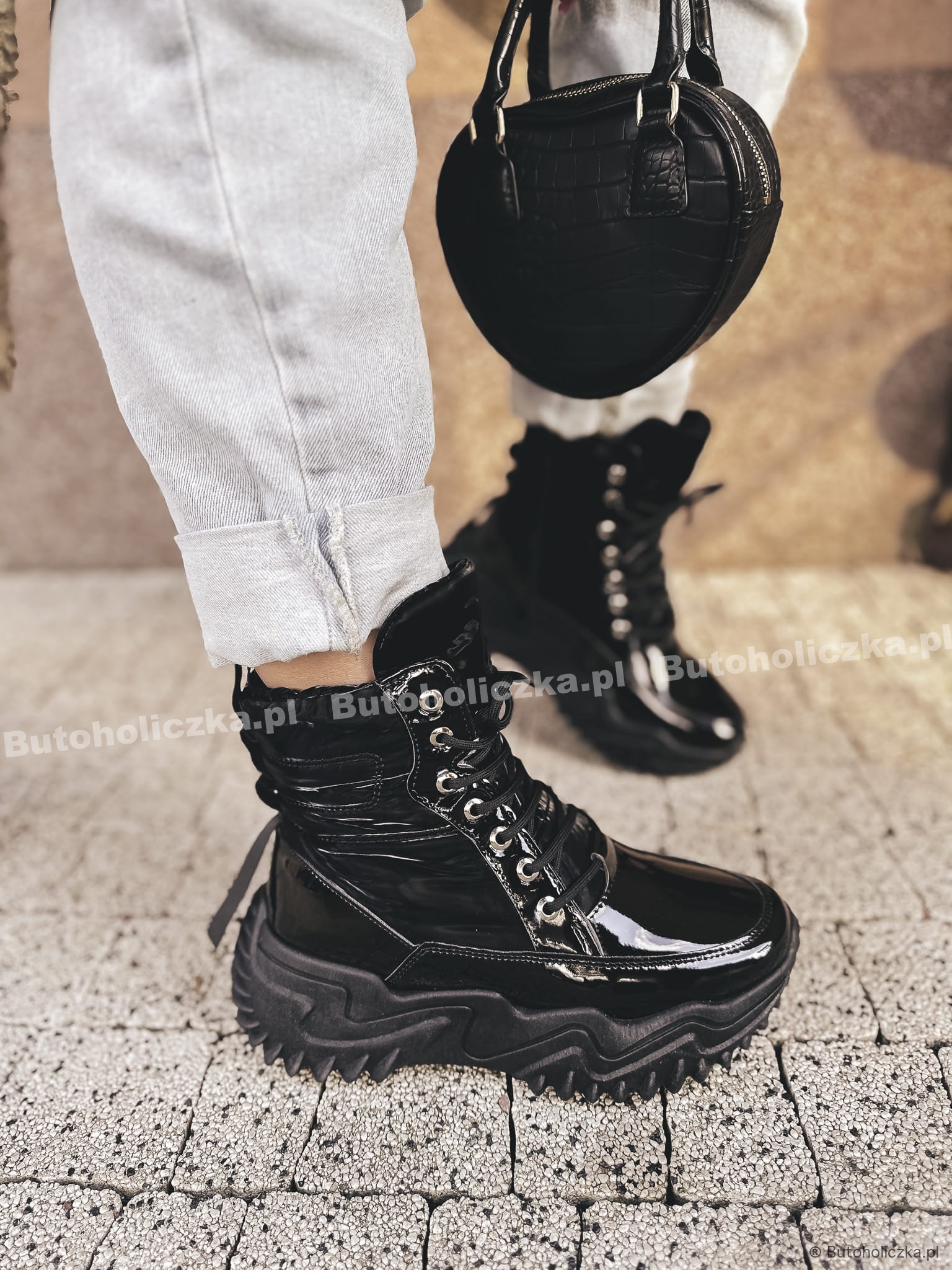 Niezwykle modne w tym sezonie botki, sznurowane, na bardzo modnej traperkowej podeszwie. Będą pasowały do każdej, zimowej stylizacji. Ocieplone milusim kożuszkiem w kolorze butów - dzięki czemu są mega cieplutkie