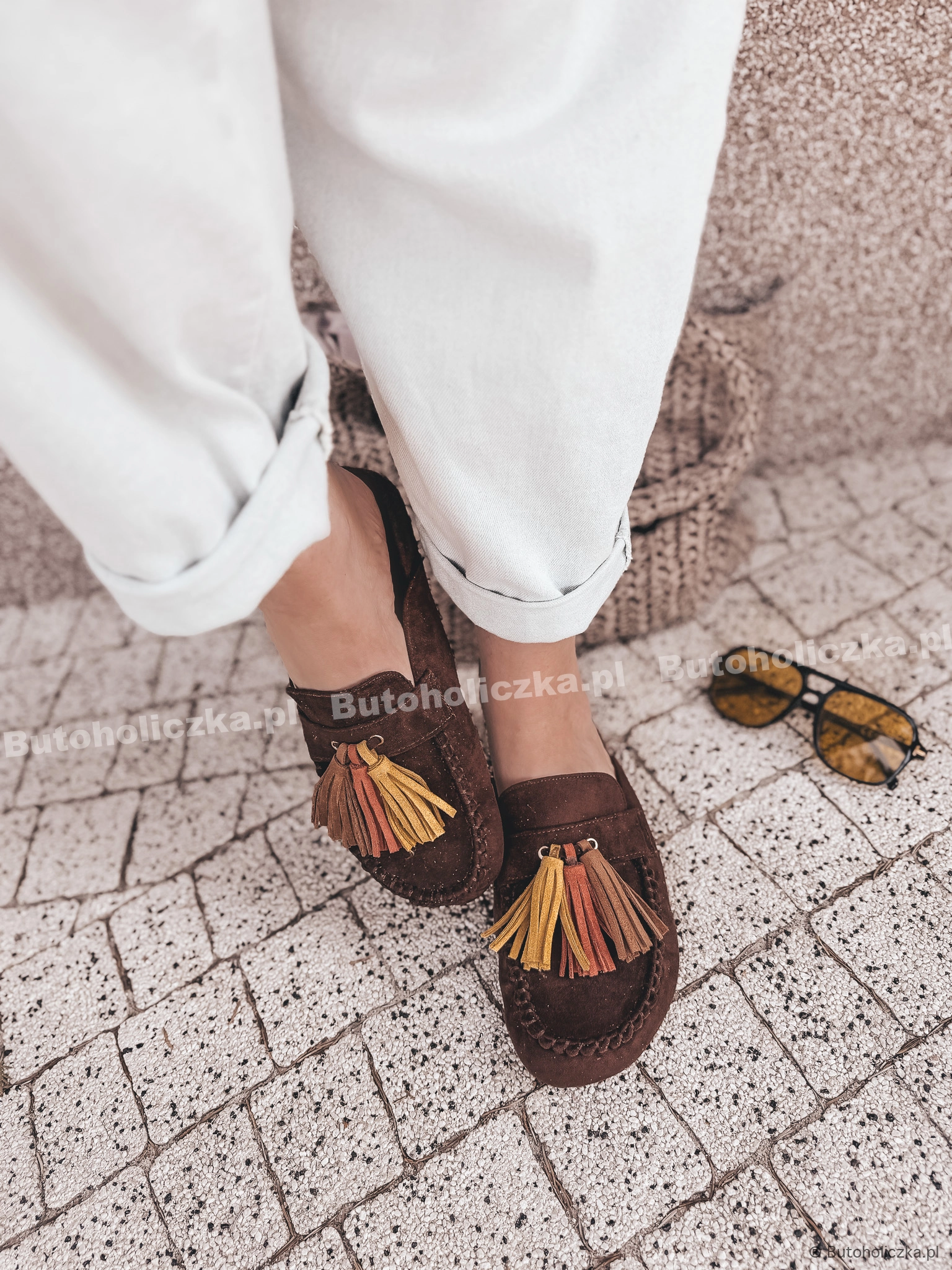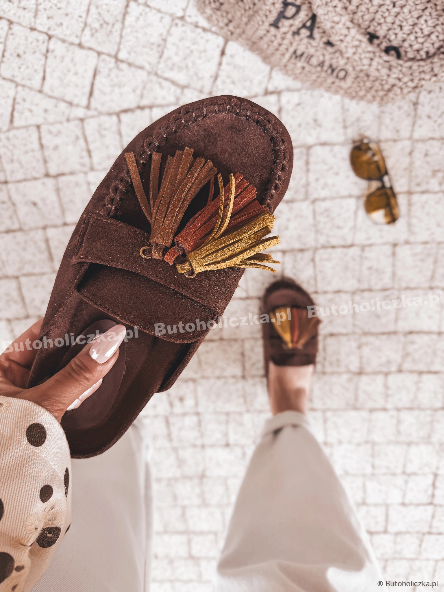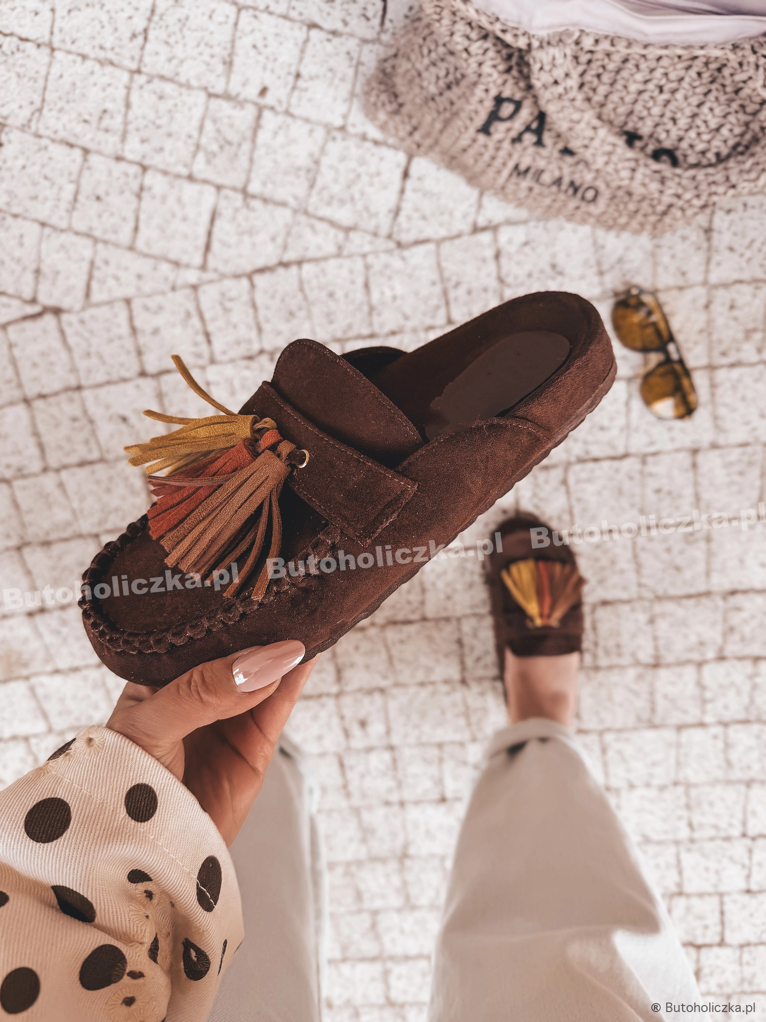 HIT Super Klapki LOCO mule z frędzlami ZAMSZOWE CZEKOLADA