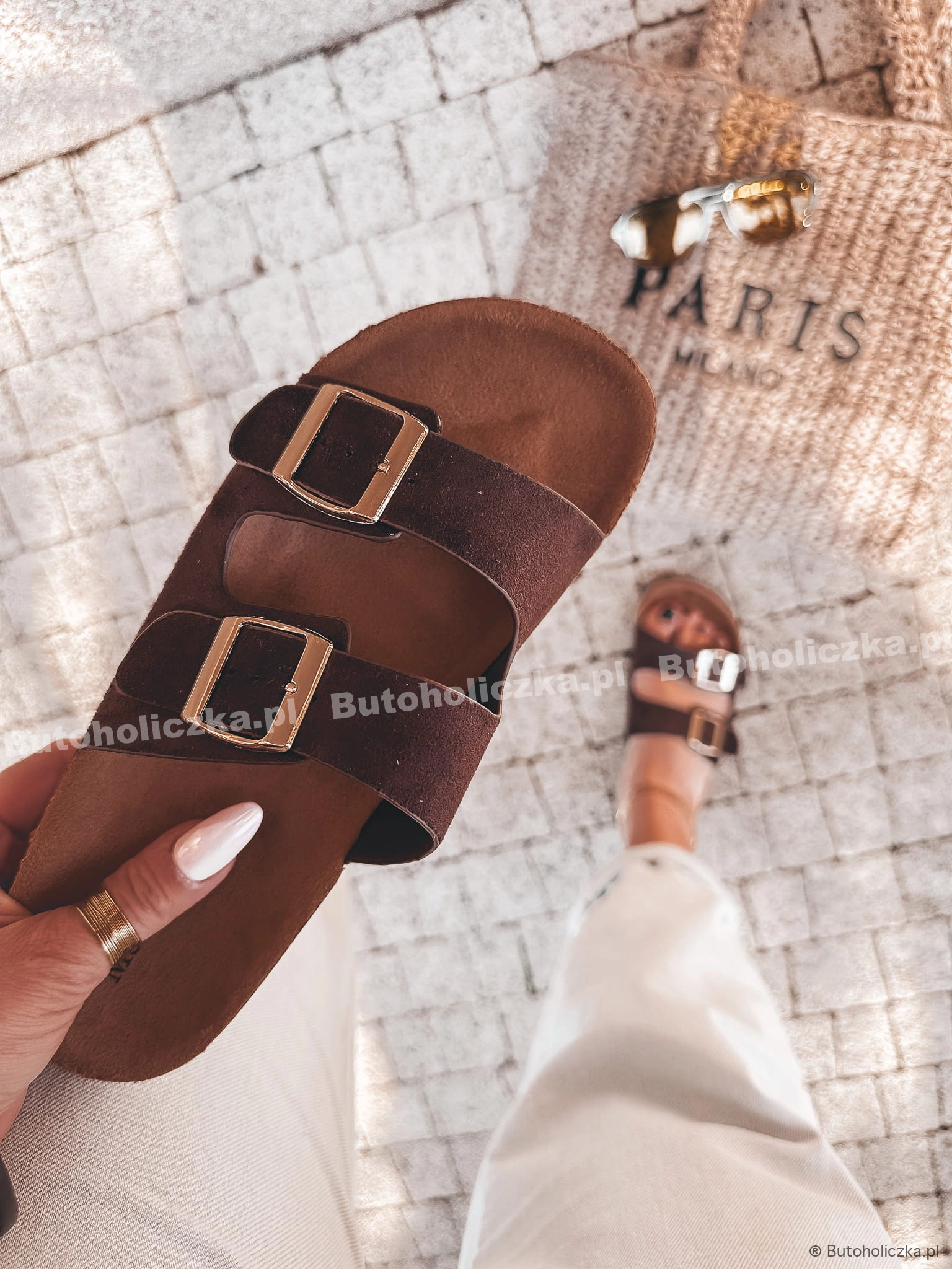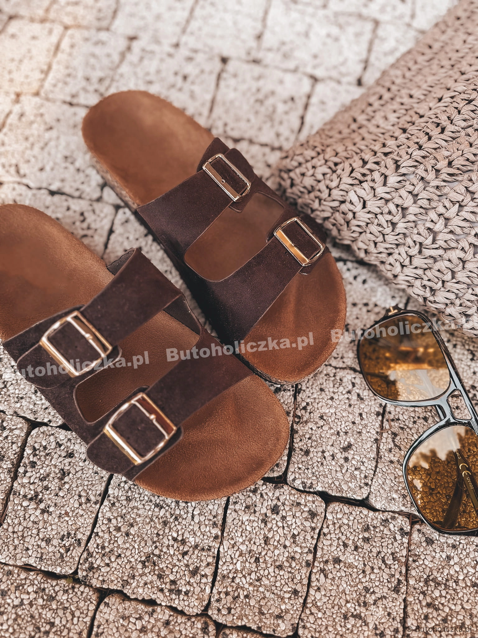 Klapki z paskiem z eko skórki, na wygodnym, wyprofilowanym korku. Znakomita propozycja do sukienek, szortów i jeansów. Wsuwane, niezwykle leciutkie i wygodne dzięki wkładce. Ozdabiane dwoma, złotymi klamerkami.