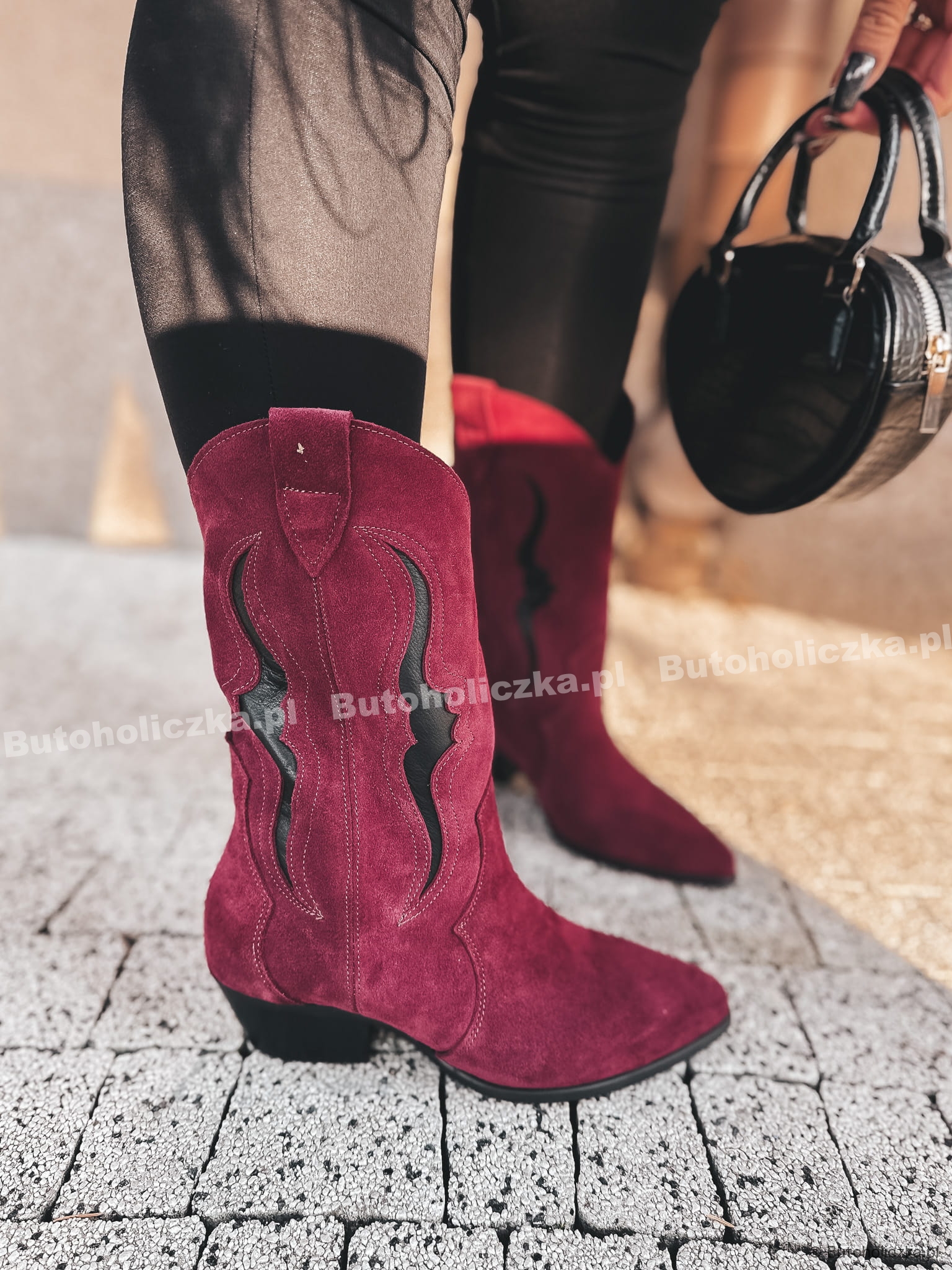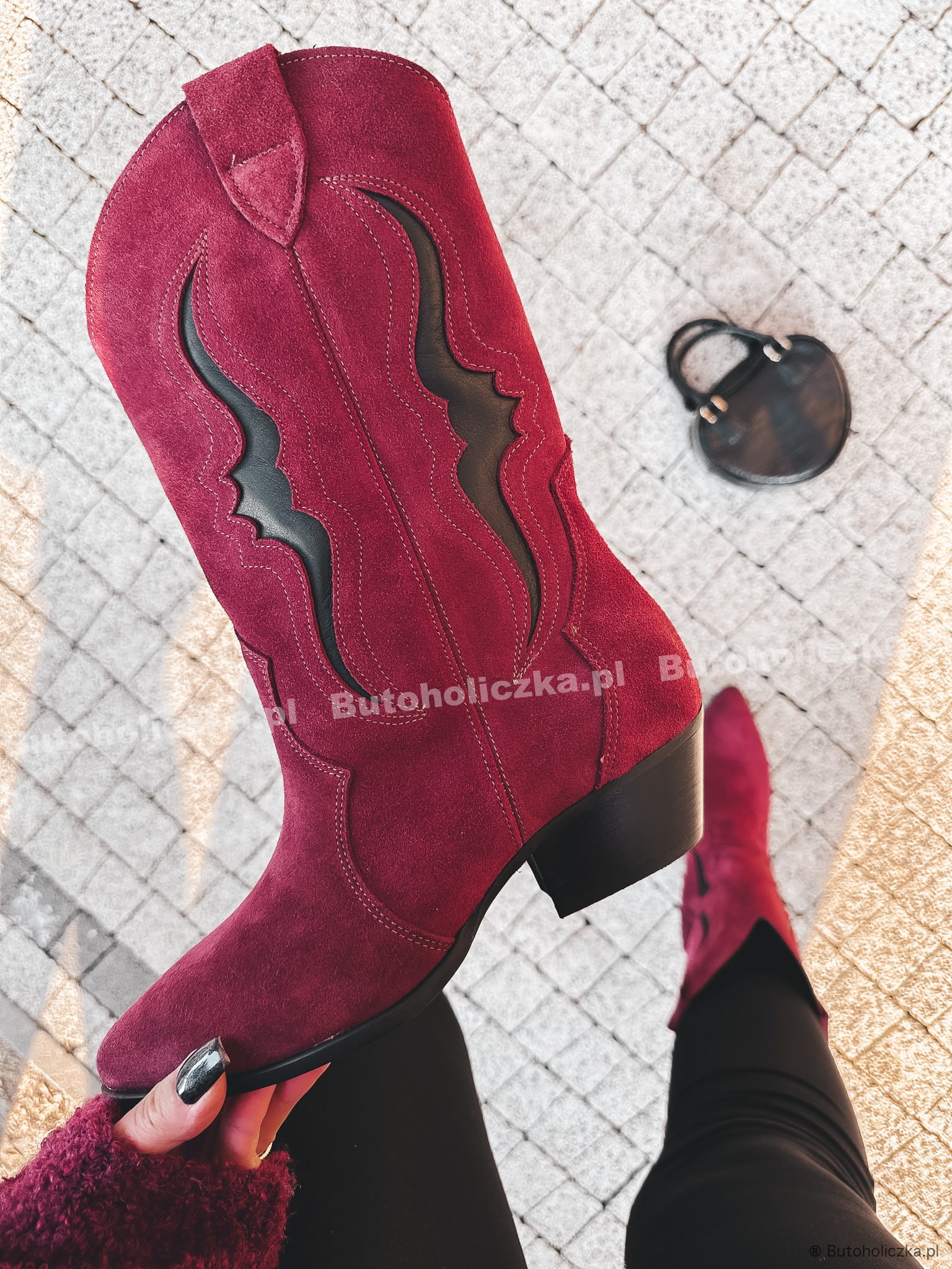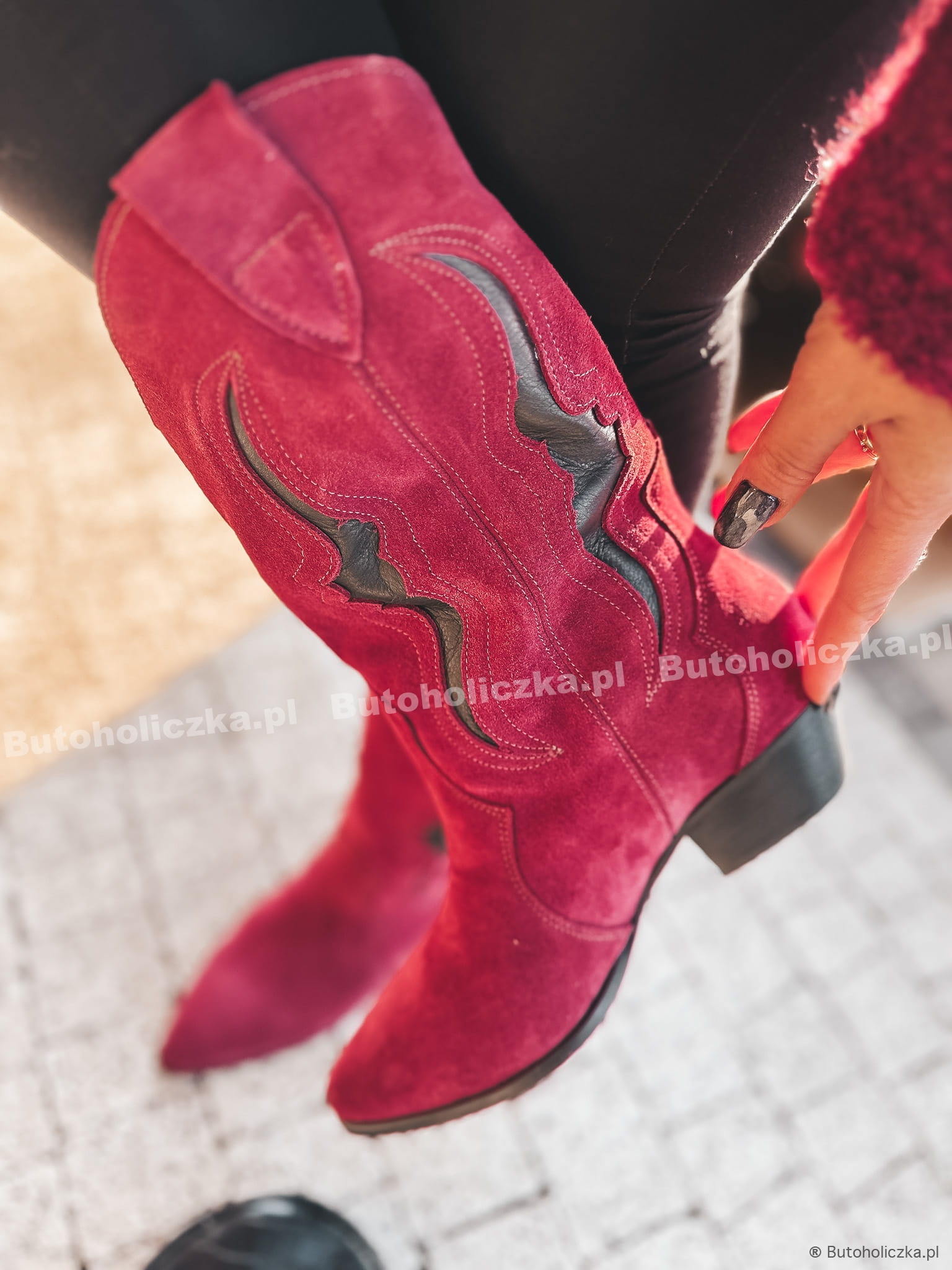 PREMIUM Kowbojki ROSAS Skóra Naturalna ZAMSZOWA BURGUND